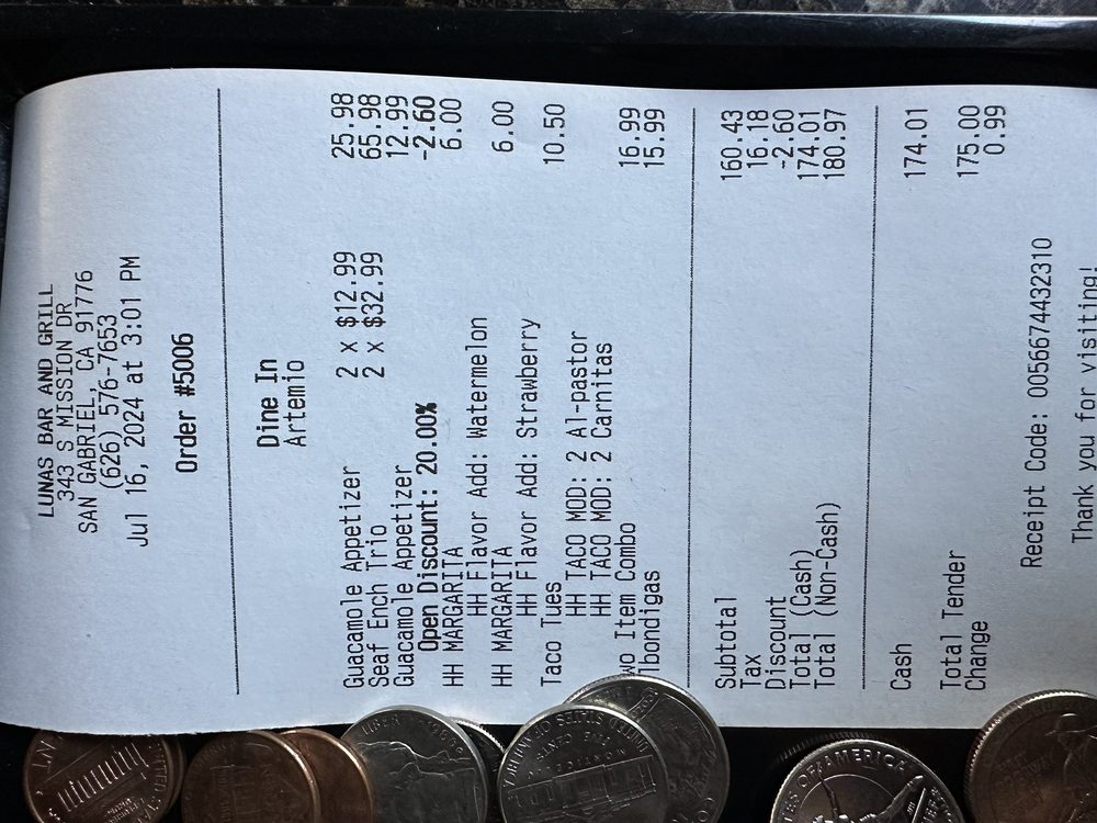 Lunas Restaurant, situated in San Gabriel, CA, is a hidden gem combining Bars, Seafood, and Mexican cuisine. The restaurant offers a wide range of utilities including reservations, delivery, takeout, and catering, catering to various preferences and needs. With an ADA-compliant entrance and restroom, Lunas ensures inclusivity for all customers. Boasting a full bar, outdoor seating, and a pool table, this venue provides a vibrant ambiance for guests. Customer reviews rave about the friendly staff, delicious food, and homemade margaritas. The Fajitas Special and Pollo Mole are standout dishes, showcasing the chef's expertise in Mexican flavors. Lunas Restaurant stands out for its impeccable service, diverse menu, and overall welcoming atmosphere, making it a must-visit spot for dining or casual outings.